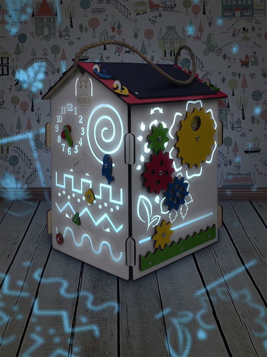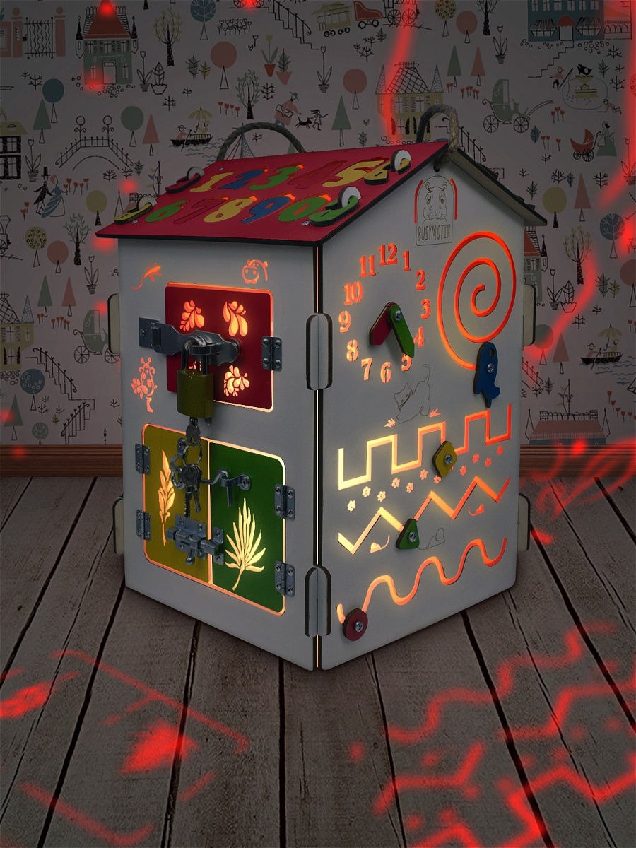 Бизидомик полезная, развивающая интеллект, мелкую моторику и логическое мышление игрушка. играя с которой, ребенок будет развивать свои пальчики и познавать мир вокруг себя. Бизиборд домик познакомит малыша с цветами и формами, поможет изучить загадочный мир цифр и времени, позволит потренировать бытовые навыки.Дополнительным преимуществом является встроенная подсветка, создавая эффектное сияние, делая игру более увлекательной.