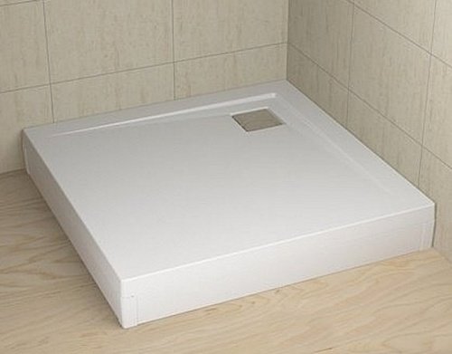 Плоский квадратный акриловый поддон со съемной панелью (из белого акрила или из алюминия), приспособленный под сифон с квадратной крышкой, с отверстием d90 мм, предназначенный для монтажа непосредственно на полу.