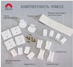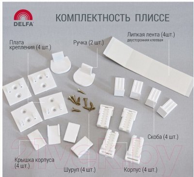 • Комплектация штора — 1шт., корпус – 4 шт., фиксатор – 4 шт., крепление – 4 шт., ручка – 2 шт., скоба – 4 шт., крышка – 4 шт., шуруп – d= 3*12 мм – 8 шт., пластина (скотч двухсторонний) – 4 шт.