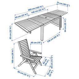 Стол (мин. длина 140 см, ср. длина 200 см, макс. длина 260 см, ширина 78 см, высота 72 см); стул (ширина 63 см, глубина 80 см, высота 101 см; ширина сиденья 44 см, глубина сиденья 48 см, высота сиденья 41 см).