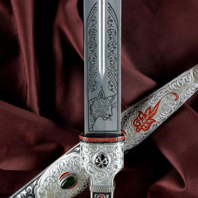 Кинжал кавказский в мельхиоре. Ножны украшаются кавказским орнаментом, выполненным чеканкой и гравировкой