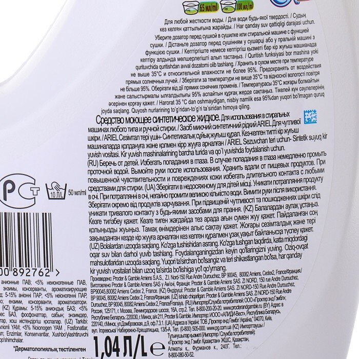 Жидкий стиральный порошок Ariel для чувствительной кожи, 1,04 л