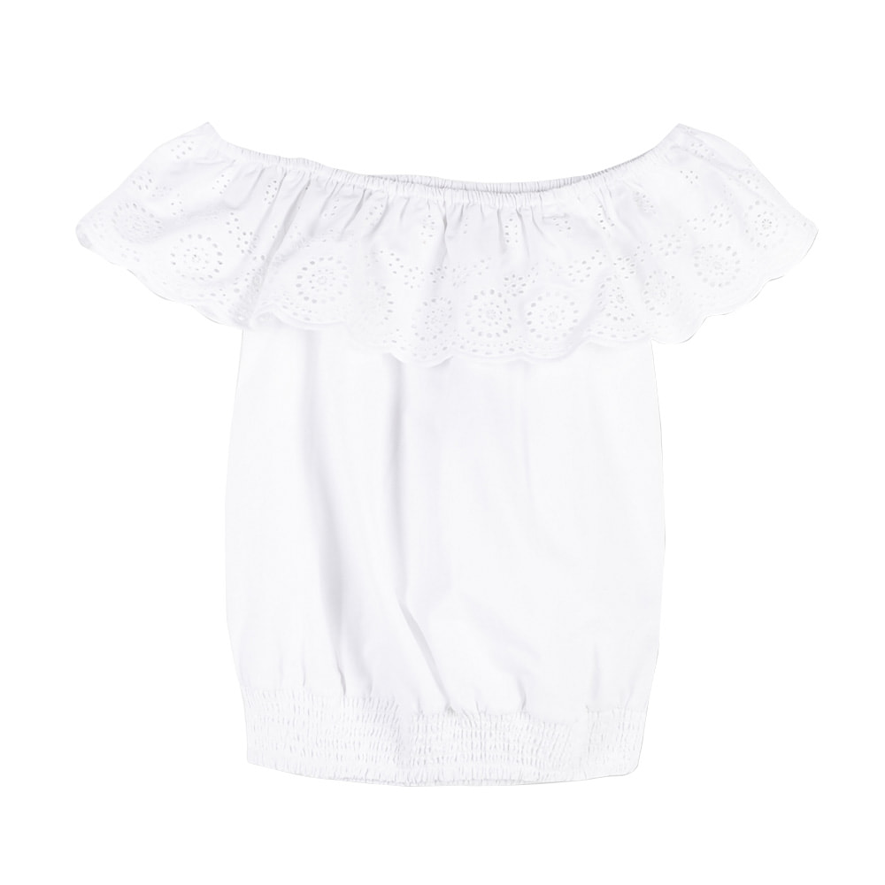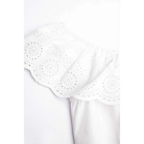 Белоснежная летняя блузка свободного покроя с открытым плечом, украшена оригинальными узорами. Блузка сшита из гипоаллергенного материала, гигроскопична, не раздражает кожу ребёнка.