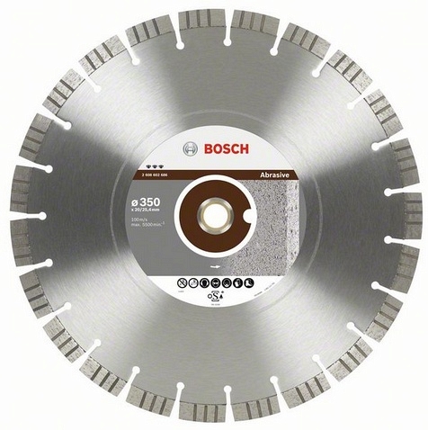 Алмазный отрезной круг BOSCH Best for Abrasive 2608602688 Предназначен для обработки мягких и абразивных материалов, таких как свежий бетон, песчаник или силикатный кирпич Особенности: Высокая скорость резки благодаря "Speed Stripes" для минимизации бокового трения Лазерная сварка алмазных режущих сегментов С переходным кольцом Высота сегмента 12 мм Ширина реза 3,6 мм