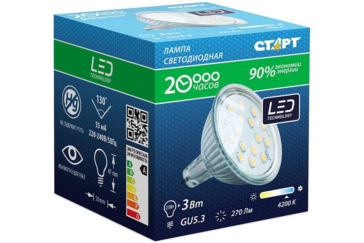 Светодиодная лампа точечного света СТАРТ LED JCDR GU5.3 6W30 имеет прочный корпус, который устойчив к повреждениям при падении, а также к вибрации и встряхиванию. Светодиодная лампа является энергоэффективным источником света. Она позволяет сократить энергопотребление на 90%. Срок службы изделия составляет 30 000 часов.