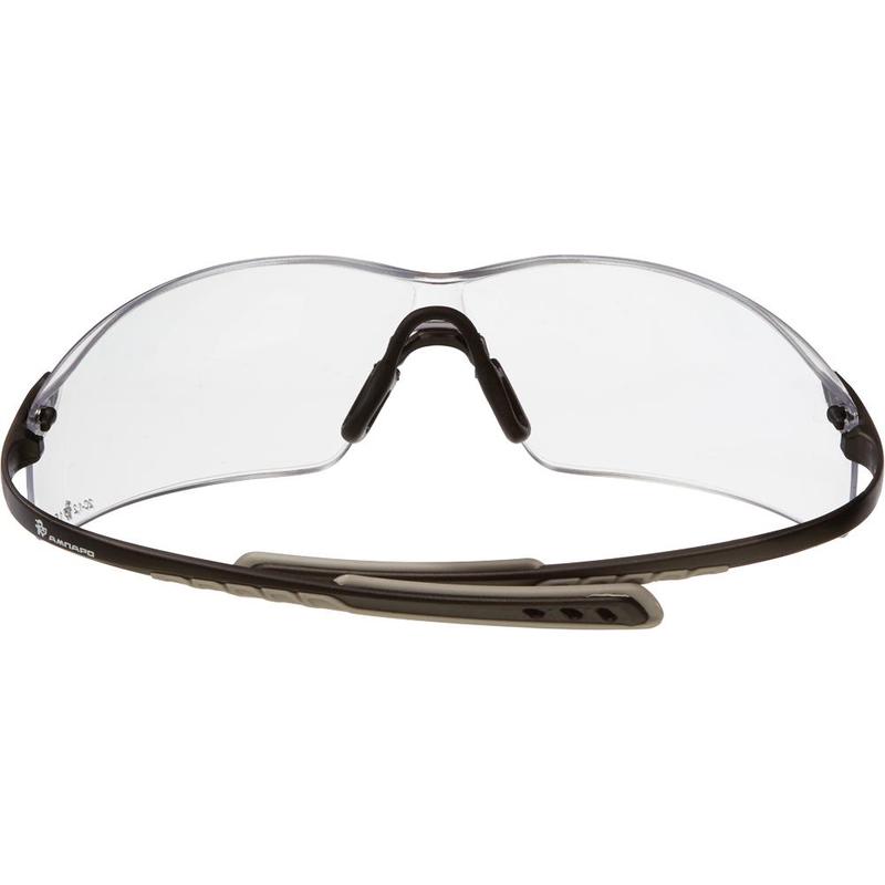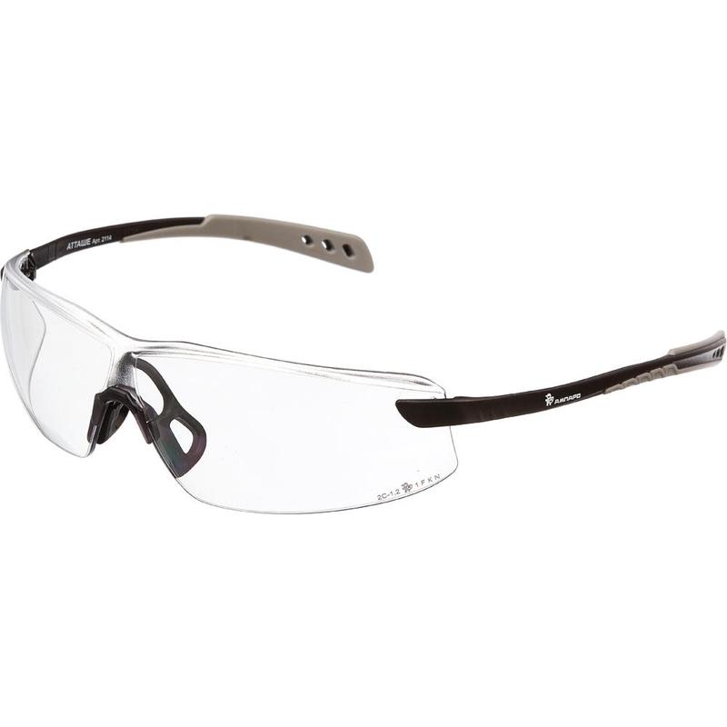 Очки защитные открытые «Ампаро Атташе» прозрачные. Линзы выполнены из прозрачного поликарбоната с антизапотевающим покрытием и покрытием против царапин. Суперлегкие очки с ультрасовременным дизайном и увеличенным обзором за счет отсутствия боковой оправы линз. Изогнутая форма линз обеспечивает дополнительную боковую защиту от летящих частиц с низким уровнем кинетической энергии и УФ-излучения. Имеют ПВХ накладку на переносице для дополнительного удобства при длительном использовании. Гибкие дужки с силиконовыми накладками на заушниках надежно фиксируют очки, что позволяет исключить возможность их смещения при работе, независимо от степени наклона головы пользователя. Код светофильтра: 2С. Градационный шифр: 1,2. Оптический класс: 1. Механическая прочность: F. Вес: 20 грамм. Рекомендованы к применению при выполнении работ на станках и устройствах для механической обработки твёрдых материалов, слесарных работах, а также при разнообразных видах работ, связанных с возможной угрозой получения травм глаз (раскалывании, дроблении, рубке и т. д.).