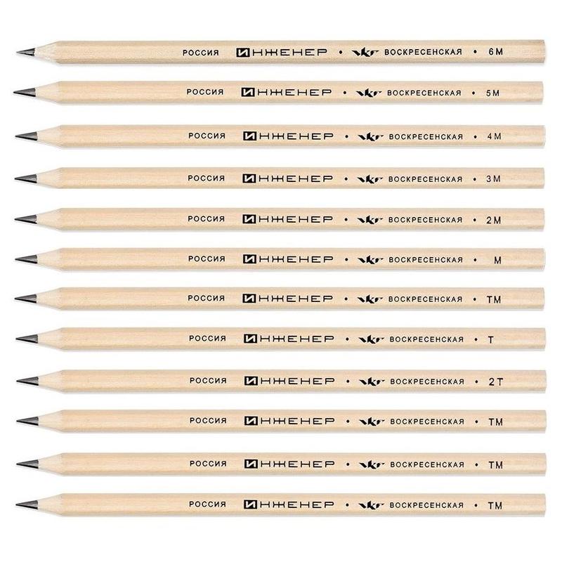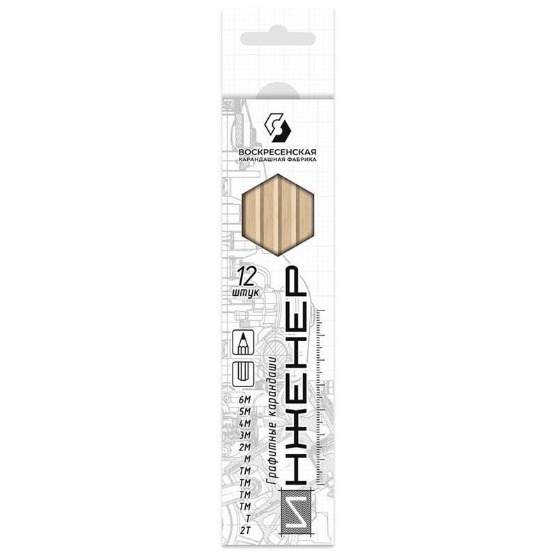 Набор графитных карандашей «Инженер», 12 штук: 2Т (2Н), Т (Н), ТМ (НВ), ТМ (НВ), ТМ (НВ), ТМ (НВ), М (В), 2М (2В), 3М (3В), 4М (4В), 5М (5В), 6М (6В), шестигранные, заточенные, диаметр 7 мм, длина 177 мм, упакованы в картонную коробку с европодвесом.