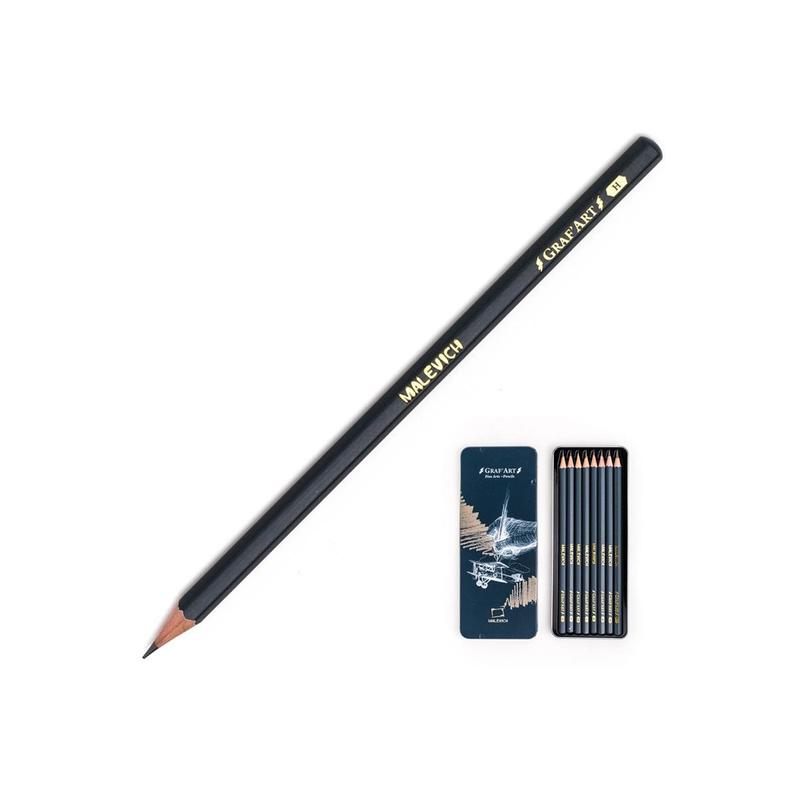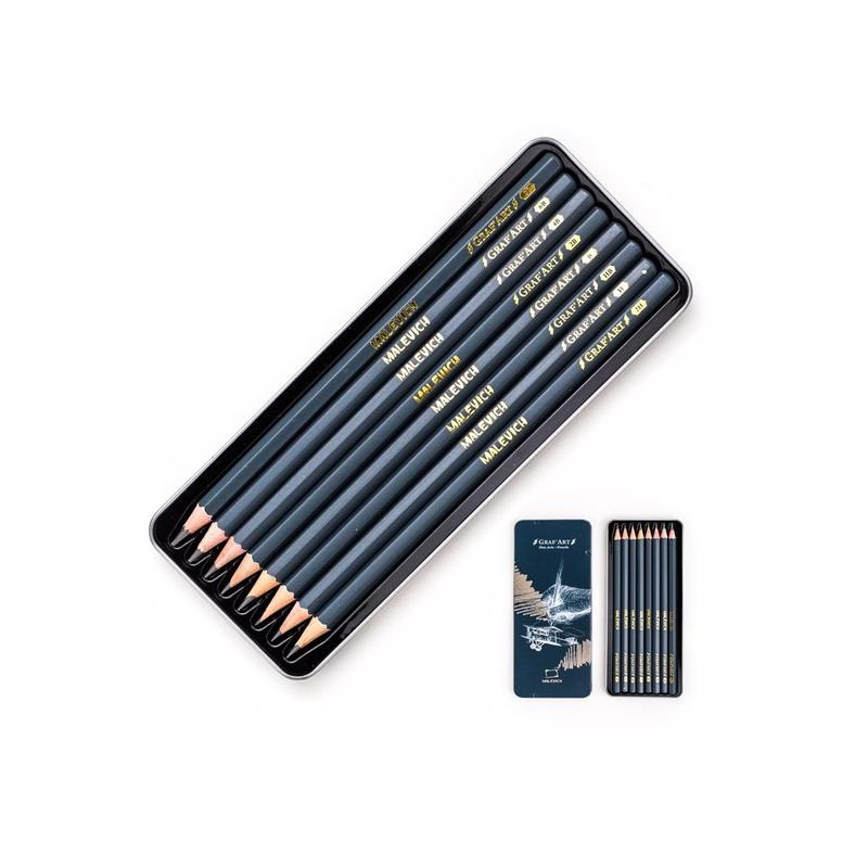 Набор чернографитных карандашей Малевичъ Graf'Art, металлическая коробка, 8 штук. Художественные чернографитные карандаши Малевичъ Graf'Art предназначены для рисования и отвечают всем требованиям, предъявляемым к профессиональной художественной продукции. Высококачественный грифель очищен от примесей, за счет чего штриховка получается равномерной и четкой. Диаметр грифеля отличается в зависимости от степени мягкости карандаша. Высококачественная древесина обеспечивает легкое затачивание, корпус и грифель не крошатся и остаются целыми даже при падении карандаша. В коллекции 3 карандаша разной степени твердости: HB, 2B, 4B.