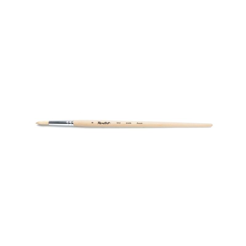 Кисть круглая из волоса щетины, обойма алюминиевая, ручка длинная, пропитана лаком. Используется для нанесения оттенков, выполнения основного объема живописной работы. Номер кисти 8.