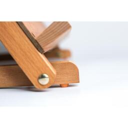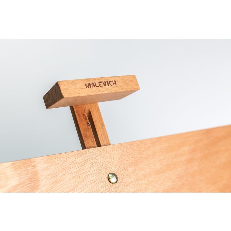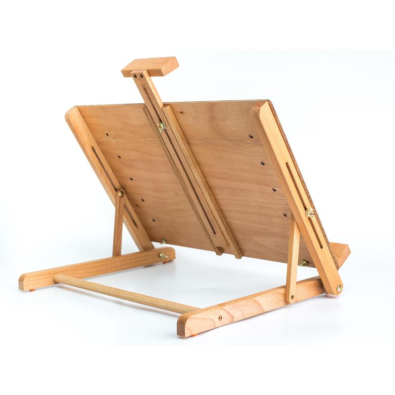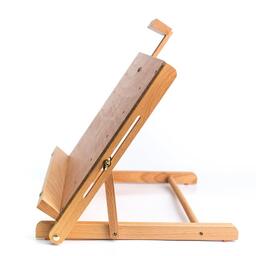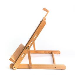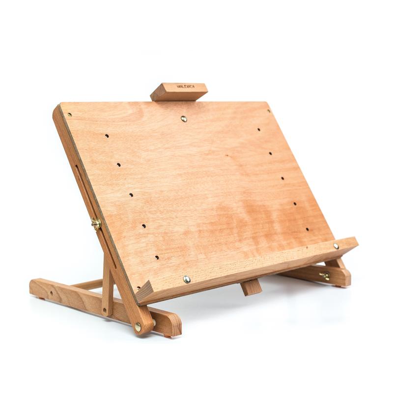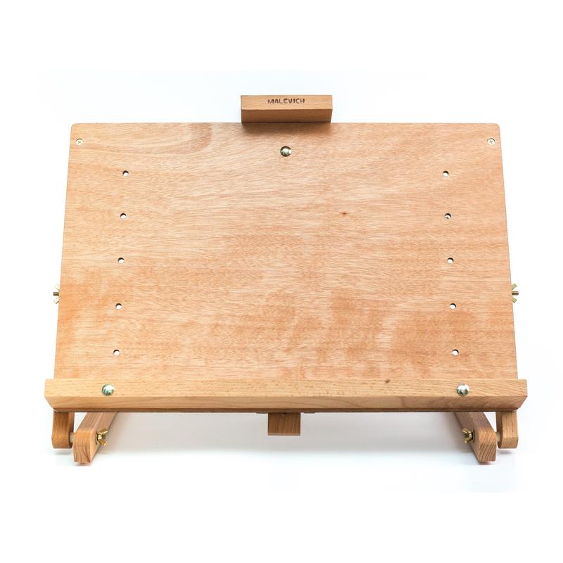 Настольный мольберт МЛ-14. Настольный мольберт с планшетом позволяет работать на бумаге. Полка и верхний зажим регулируется винтами-барашками. Угол наклона регулируется вплоть до плоского состояния. Выполнен из промасленного бука. Максимальная высота холста 53 см. Ширина 50 см, глубина 37 см. Высота от 39 до 68 см. Вес 2 кг.