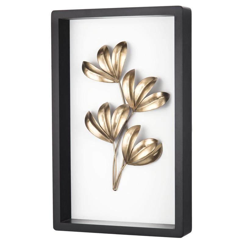 Декоративное настенное панно в матовой деревянной раме черного цвета с белой подложкой. Объемные листья растений выполнены из металла и тонированы в золотистый цвет.
