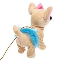- Дополнительно Сумочка 25 x 10 x 17 см. Длина поводка 70 см. Играет 'Песенка про друга', группа Барбарики. Собачка ходит, виляет хфостиком, лает, скулит.