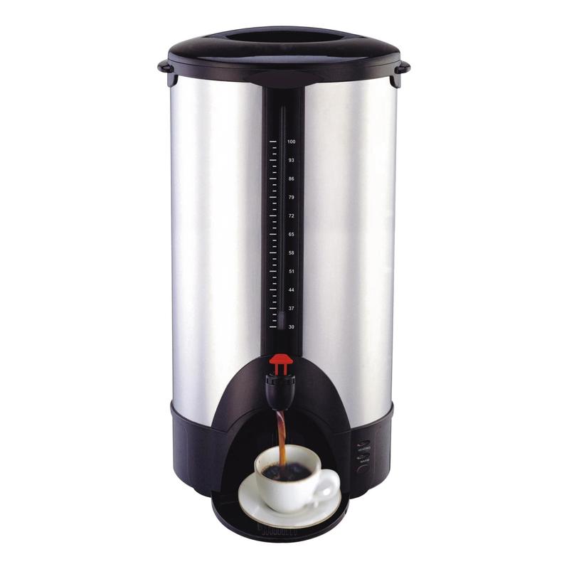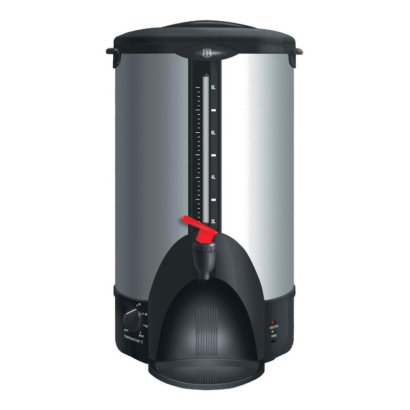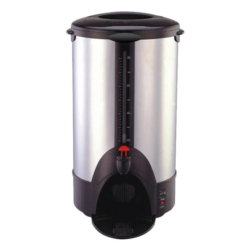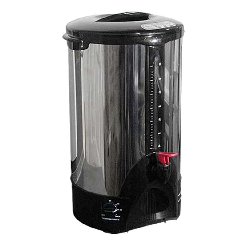 Кипятильник электрический наливной GASTRORAG DFQ-80 - безусловный хит продаж нашего интернет-магазина, обладающий наилучшим соотношением цена/качество. Корпус оборудования изготовлен из прочной, гигиеничной, устойчивой к коррозии пищевой нержавеющей стали с элементами из черной пластмассы, внутренний резервуар - полностью из нержавеющей стали. Заливной кипятильник GASTRORAG DFQ-80 не требует подключения к водопроводу и обеспечит вас горячей водой повсюду, где есть электрические розетки 220 В. Емкость резервуара составляет 8 л, что дает возможность использовать электрокипятильник как на предприятиях общепита малой и средней пропускной способности, так и на домашней кухне. Оборудование оснащено регулируемым термостатом, который позволяет задавать температуру воды в диапазоне 45-100°C, и защитой от сухого включения. Время кипячения полного резервуара составляет 40-50 минут в зависимости от начальной температуры воды. По достижении заданной температуры в целях экономии электроэнергии кипятильник автоматически переходит в режим подогрева. Электрокипятильник GASTRORAG DFQ-80 имеет скрытый ТЭН, упрощающий процедуру ухода и очистки от накипи. Розлив воды осуществляется через пластмассовый кран, расположенный в нижней части устройства. Для удобства пользователя рычаг крана имеет два положения: - постоянно открыто для непрерывного слива кипятка, - автоматическое прекращение слива кипятка после отпускания рычага. Уровень воды в резервуаре легко контролировать по показаниям мерного стекла.