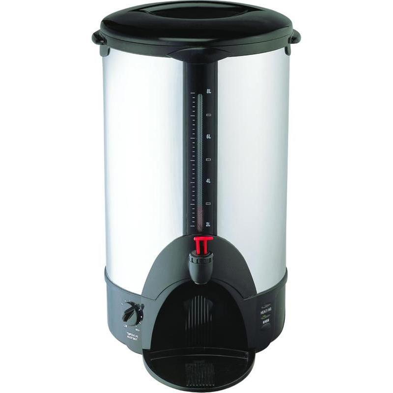 Уценка. Товар не был в эксплуатации. Причина уценки: Нетоварный вид упаковки (рваная, мятая). Ограничений в дальнейшей эксплуатации нет.Кипятильник настольный автономный Gastrorag DFQ-80 с краном для розлива. Имеет терморегулятор. Материал корпуса — нержавеющая сталь и черная пластмасса. Гарантия на товар и/или на его составные части распространяется, в соответствии с действующим законодательством РФ. Уцененный товар подлежит возврату или обмену в случае обнаружения недостатков, о которых покупатель не был проинформирован перед покупкой.