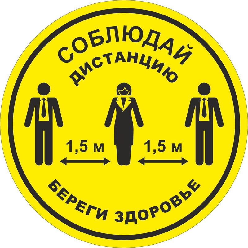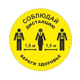 Табличка для разметки «Соблюдай Дистанцию — Береги Здоровье» желтого цвета. Износоустойчивые напольные наклейки применяют для визуального цветового и текстового информирования людей о необходимой социальной дистанции и помогают соблюдать фактическую рекомендуемую дистанцию. Защитный материал напольной разметки устойчив к умеренным кислотным, щелочным и солевым растворам, моющим и чистящим средствам. Хорошо очищается и моется. Приклеивается на сухую, чистую поверхность. Для увеличения срока службы напольной разметки перед наклеиванием рекомендуется протереть место наклеивания спиртовым очищающим составом и насухо протереть салфеткой. Материал: ПЭТ. Толщина — 100 микрон. Диаметр: 200 мм. Термоустойчивость от −40 до 70 °С. Температура склеивания > 15 °C. Товар поставляется в нескольких вариантах дизайна (без возможности выбора).