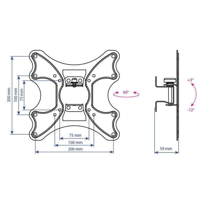 Кронштейн для LED/LCD телевизоров 15"-42″, max 20 кг, настенный, 2 ст свободы, наклон +3° −12°, поворот 60°, от стены 59 мм, max VESA 200×200 мм, съемная монтажная пластина, быстрая фиксация наклона
