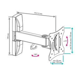 Кронштейн VLK TRENTO-2 предназначен для всех LED/LCD телевизоров с диагональю экрана от 10 до 32 дюймов (25-81 см). Изготовлен из высококачественной стали и способен выдерживать нагрузку до 20 кг. Многофункциональное крепление VLK TRENTO-2 позволит наклонять и поворачивать экран Вашего ТВ, а так же сдвигать и отодвигать его от стены, при помощи дополнительного колена. Вы с легкостью можете установить любое удобное для просмотра положение экрана.Кронштейн VLK TRENTO-2 легко установить на стену, благодаря съемной монтажной пластине.В комплект поставки, входит полный монтажный набор всех крепежный и соединительных деталей. Декоративные настенные накладки придают конструкции законченный внешний вид. Максимальные посадочные отверстия по горизонтали — 100 мм, по вертикали — 100 мм. Поддерживаемые стандарты VESA: 50×50, 75×75, 100×100