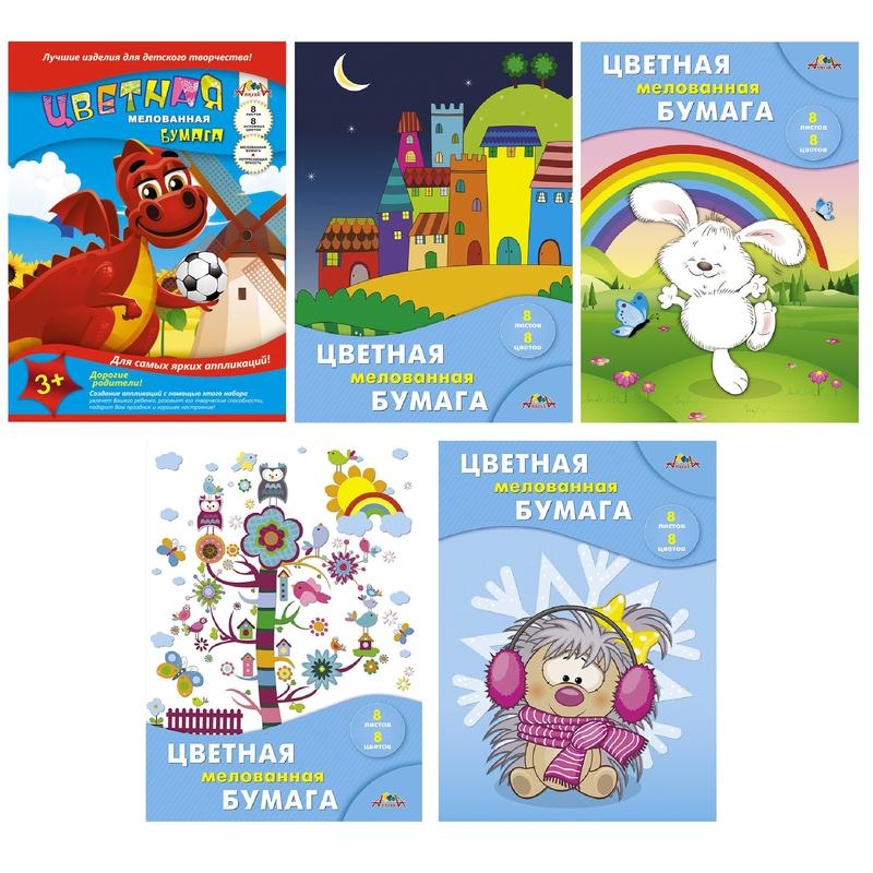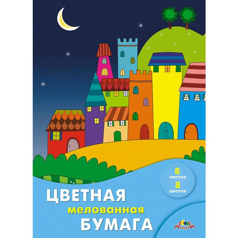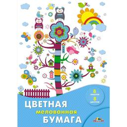 Цветная мелованная бумага, 8 листов, 8 цветов, формат А4, плотность 65 г/кв.м. Внутренний блок — мелованная бумага двойного прокраса, что дает насыщенность цвета. В наборе цвета: красный, голубой, коричневый, желтый, зеленый, оранжевый, черный, фиолетовый. Крепление — скоба, обложка — мелованная бумага. Рекомендуется детям от 3 лет. Внимание! Товар поставляется в разных вариантах цвета/дизайна (без возможности выбора).