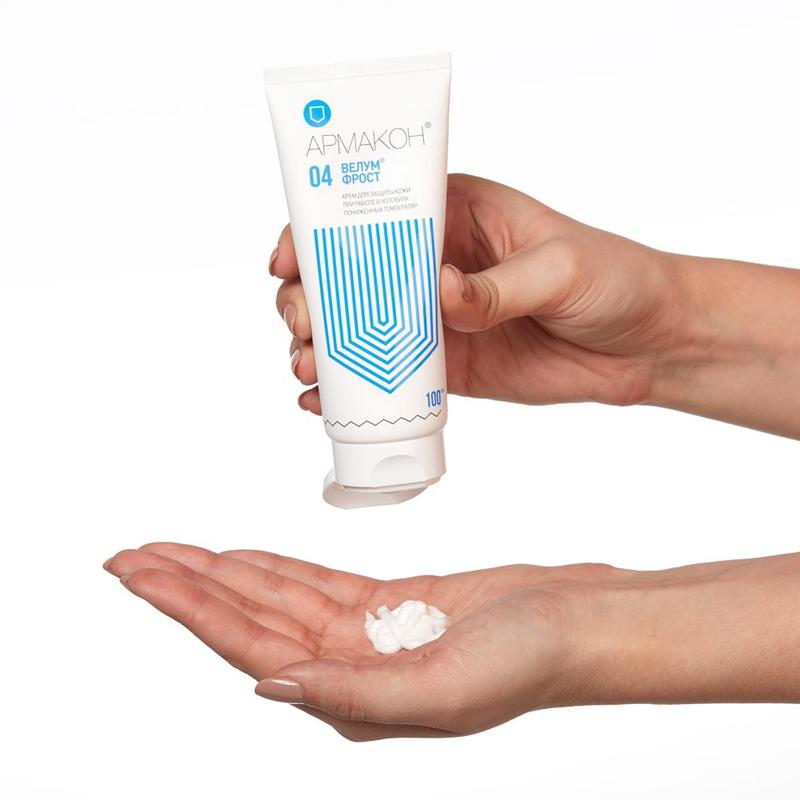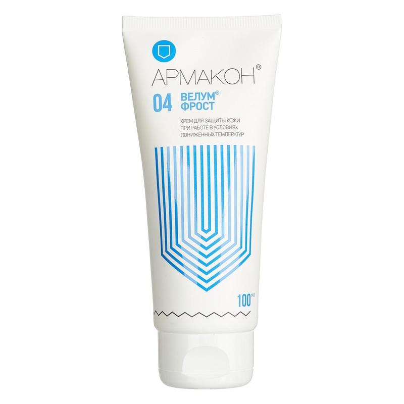 «Армакон Велум Фрост» — жировой крем, не содержащий воды, и обладающий защитными свойствами от обветриваний и обморожений; наносится на кожу легко и требуется в небольших количествах. Вместо воды в креме используется петролатум и жидкий парафин. Покрывая кожу, они препятствуют негативному воздействию факторов окружающей среды и создают защитный барьер, предотвращающий раздражение и потерю влаги. Профессиональный защитный крем «Армакон Велум Фрост» служит для защиты кожи при низких температурах. Незаменим для тех, кто работает на открытом воздухе при морозе, ветре, снеге, рефрижераторах. В состав крем также входят ухаживающие компоненты, повышающие защитные функции кожи и восстанавливающие гидролипидную пленку. Оливковое масло, обогащенное витамином А, повышает эластичность кожи. Масло Ши питает кожу и защищает от негативного воздействия ультрафиолетовых солнечных лучей. Пчелиный воск обладает выраженными бактерицидными свойствами. Витамины А и Е — антиоксиданты, активизируют регенерацию и заживление кожи. Глицерин обладает способностью аккумулировать влагу из воздуха и насыщать ею кожу. Рекомендуемая температура крема — до −50 °C.Гипоаллергенный. Наносится на лицо, руки, открытые участки тела и растирается.Не содержит воды, силиконов, красителей, парабенов, формальдегид-производных.Упаковка: туба 100 мл.Условия хранения: избегать попадания прямых солнечных лучей.Срок годности от даты изготовления 24 месяца.