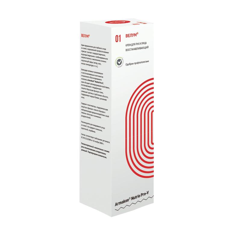 Крем «Армакон Велум» — восстанавливающий крем для рук и лица. Предназначен для глубокого ухода за кожей, подверженной профессиональным стрессам (контакт с водорастворимыми, водонерастворимыми и комбинированными загрязнителями) и негативному влиянию окружающей среды (ветер, снег, низкие температуры и т. п.).Благодаря входящему в состав специальному сбалансированному комплексу витаминов, увлажняющих и питательных компонентов Armakon® Nutrio Pro-V, крем успокаивает и смягчает кожу, помогает в полной мере восстановить целостность кожного покрова, обладает регенерирующими свойствами, восстанавливает и поддерживает защитно-барьерную функцию кожи, уменьшает эритему в проблемных областях, поддерживает водный баланс, увлажняет кожу.Витамин Е — антиоксидант, увлажняет кожу, стимулирует процесс регенерации тканей. Глицерин обладает способностью аккумулировать влагу из воздуха и насыщать ее кожу. Аллантоин является эффективным заживляющим средством, обладает противовоспалительным действием. Кератин, изопропил пальмитат, жидкий парафин обладают великолепными смягчающими и регенерирующими свойствами.ВЕЛУМ содержит инактиваторы, поддерживающие защитную функцию кожного барьера и нейтрализующие вредное воздействие солей тяжелых металлов и химических раздражителей.Гипоаллергенность подтверждена сертификационным центром Service Allergy Swiss (SAS, Швейцария).Состав соответствует требованиям регламента ЕС № 1223/2009.Рекомендуется для ежедневного ухода за кожей.Не содержит силиконов, красителей, парабенов, формальдегид-производных.ТР ТС 019/2011, ГОСТ 31460–2012Упаковка: туба 100 мл.Условия хранения6 избегать попадания прямых солнечных лучей.Срок годности от даты изготовления 24 месяца.