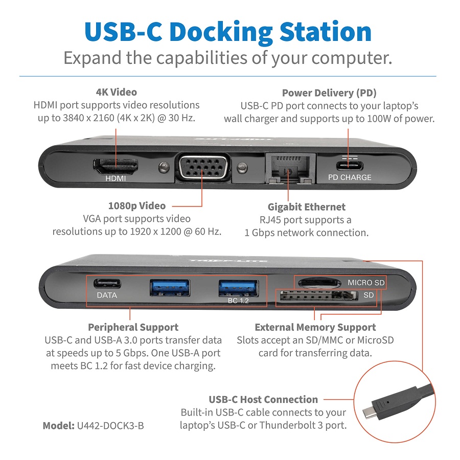 Док-станция USB-C: 4K HDMI, VGA, USB 3.2 Gen 1, концентратор USB-A/C, GbE, разъем для карты памяти, зарядка PD Charging (100 Вт). Обеспечивает устройство Chromebook, портативный компьютер или ПК с ОС Windows дополнительными интерфейсами HDMI, VGA, USB, PD Charging и другими портами. Подключение к проводной сети Gigabit Ethernet (10/100/1000 Мбит/с) при отсутствии Wi-Fi.