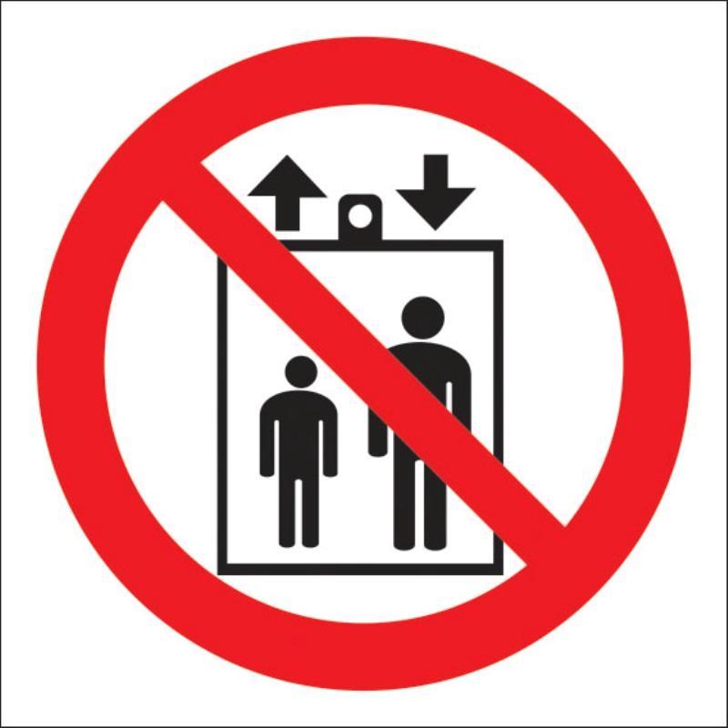 Знак безопасности «Запрещается пользоваться лифтом для подъема (спуска) людей». Код знака: Р34. Знак изготовлен из самоклеящейся пленки. Используется для запрета пользования лифтом для подъема/спуска людей. Формат: 200×200 мм.