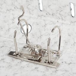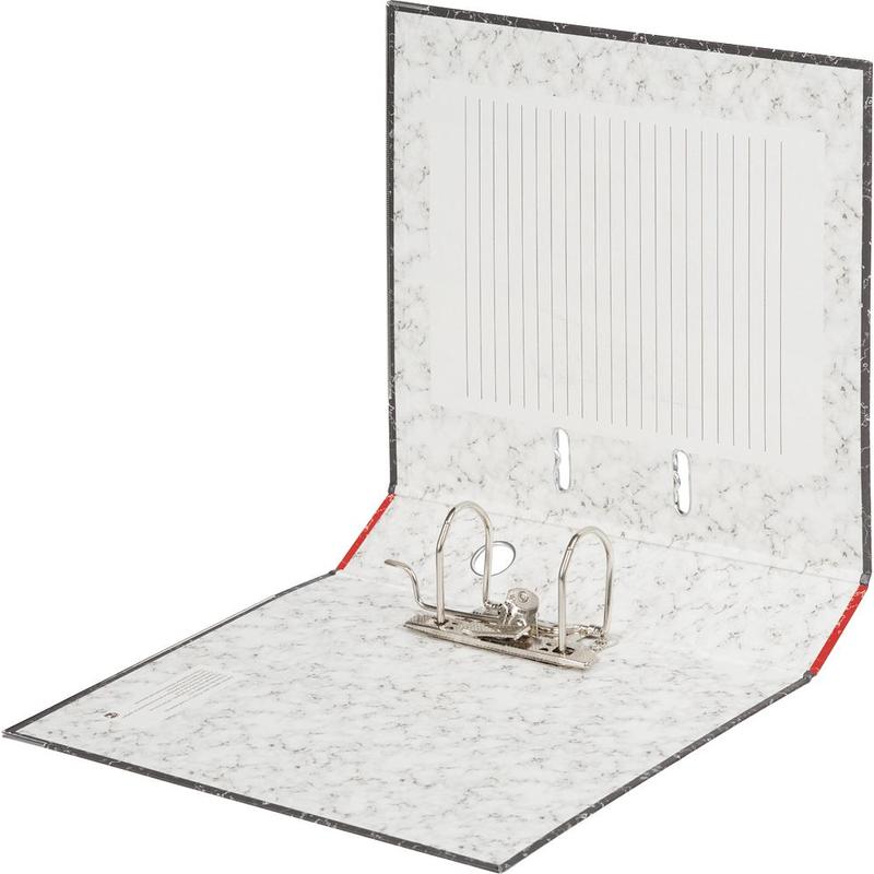 Папка-регистратор с арочным механизмом изготовлена из плотного картона толщиной 2 мм, с внешней стороны оклеена износостойкой бумагой «под мрамор». Формат А4. Нижние края защищены металлическим кантом. Прорези на внешней крышке удерживают папку закрытой даже при большом количестве документов. На корешок красного цвета шириной 75 мм наклеена этикетка, есть кольцо для захвата. Папка-регистратор вмещает до 480 листов стандартной плотности.