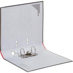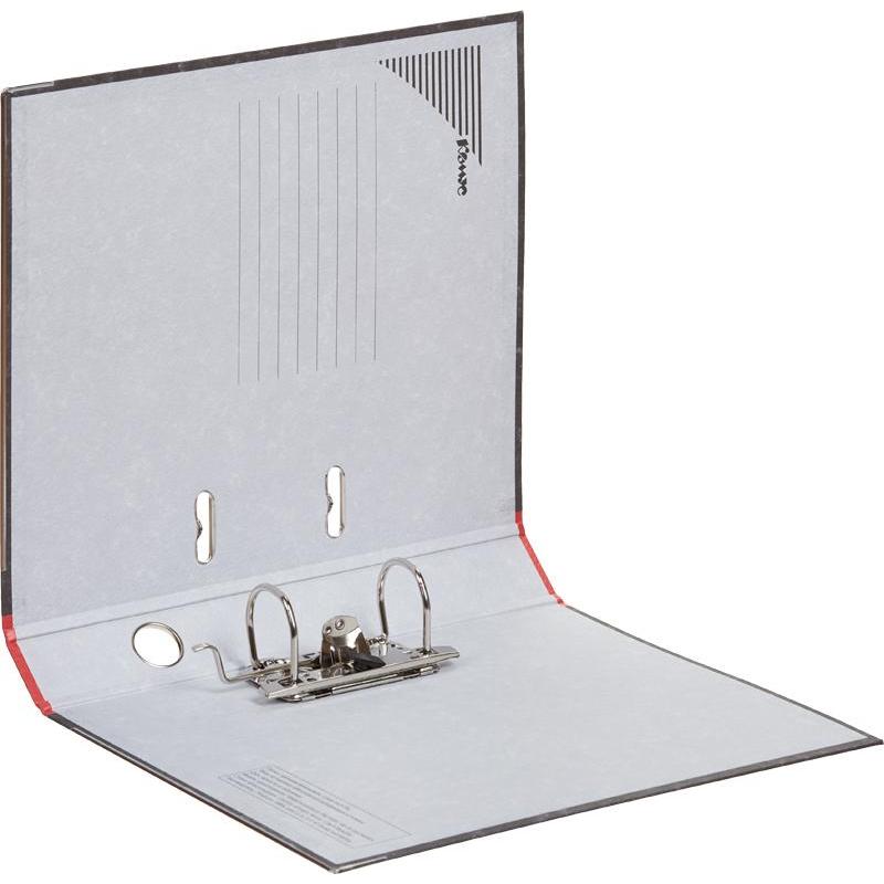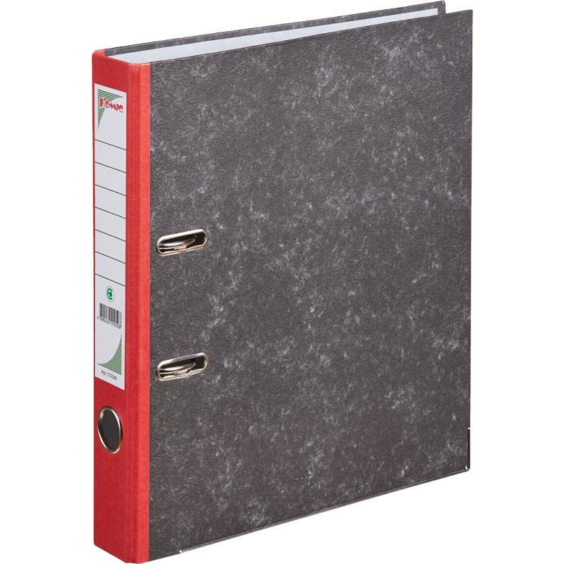 Папка-регистратор с арочным механизмом Комус формата А4 изготовлена из плотного картона, покрытого фактурной бумагой под мрамор, производства Великобритания. Арочный механизм произведен в Чехии. Нижние края защищены металлическим кантом. Корешок — бумвинил, красного цвета, ширина — 50 мм. Специальные прорези на крышке не дают папке открываться при большом количестве вложенных документов. На корешке имеется карман со сменной этикеткой, отверстие для удобного захвата. Папка-регистратор вмещает до 350 листов стандартной плотности.