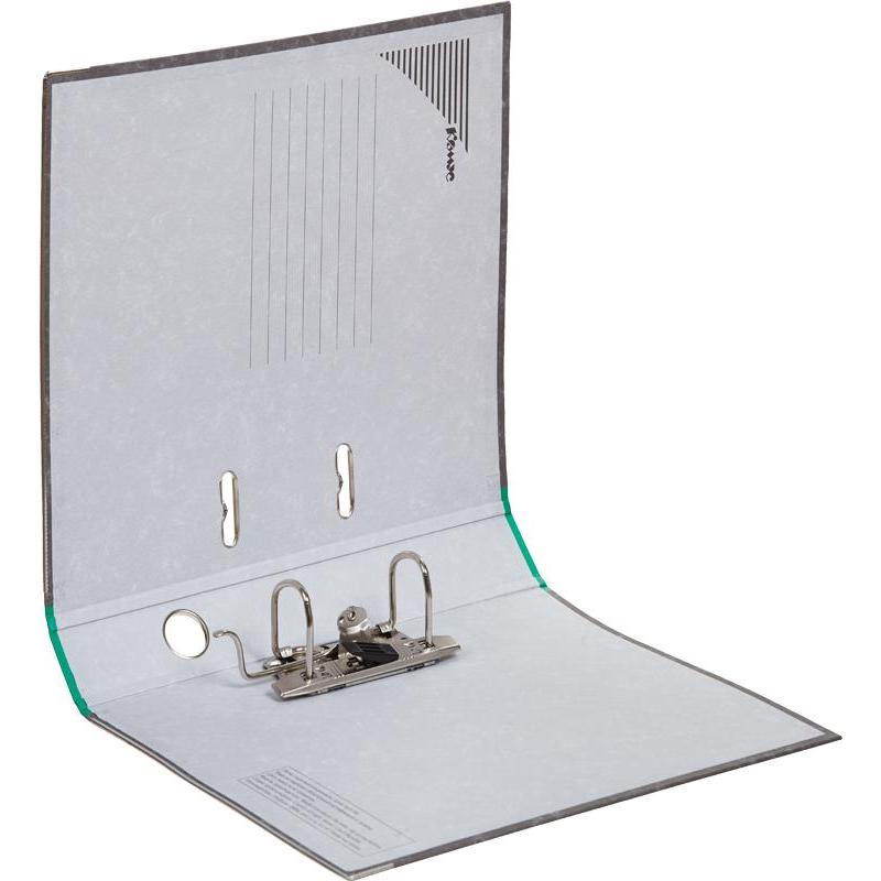 Папка-регистратор с арочным механизмом Комус формата А4 изготовлена из плотного картона, покрытого фактурной бумагой под мрамор, производства Великобритания. Арочный механизм произведен в Чехии. Нижние края защищены металлическим кантом. Корешок — бумвинил, зеленого цвета, ширина — 50 мм. Специальные прорези на крышке не дают папке открываться при большом количестве вложенных документов. На корешке имеется карман со сменной этикеткой, отверстие для удобного захвата. Папка-регистратор Комус вмещает до 350 листов стандартной плотности.