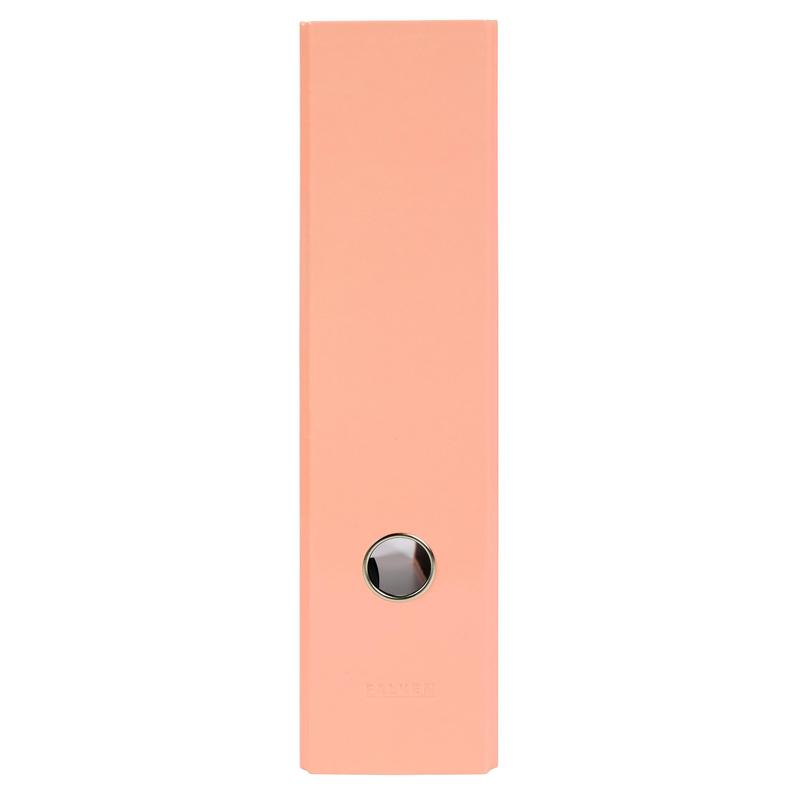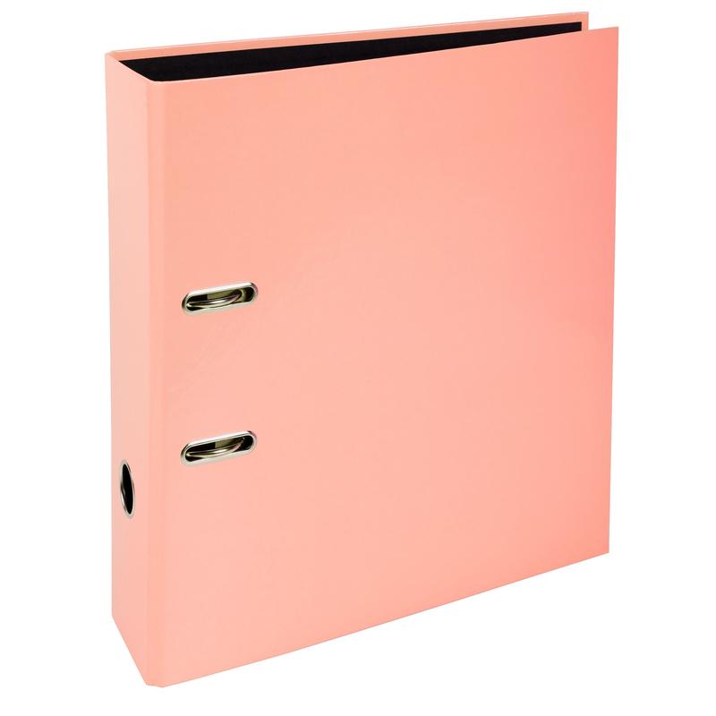 Папка-регистратор изготовлена из глянцевого картона формата A4. Цвет — коралловый. Ширина корешка — 80 мм. Вмещает около 760 листов стандартной плотности. Страна происхождения — Германия.