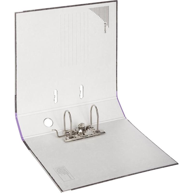 Папка-регистратор с арочным механизмом формата А4 изготовлена из плотного картона, покрытого фактурной бумагой под мрамор, произведенной в Великобритании. Нижние края защищены металлическим кантом. Корешок — бумвинил, фиолетового цвета, ширина корешка 75 мм. На корешке имеется карман со сменной этикеткой и кольцо для захвата. Арочный механизм произведен в Чехии. Папка-регистратор вмещает до 480 листов стандартной плотности.