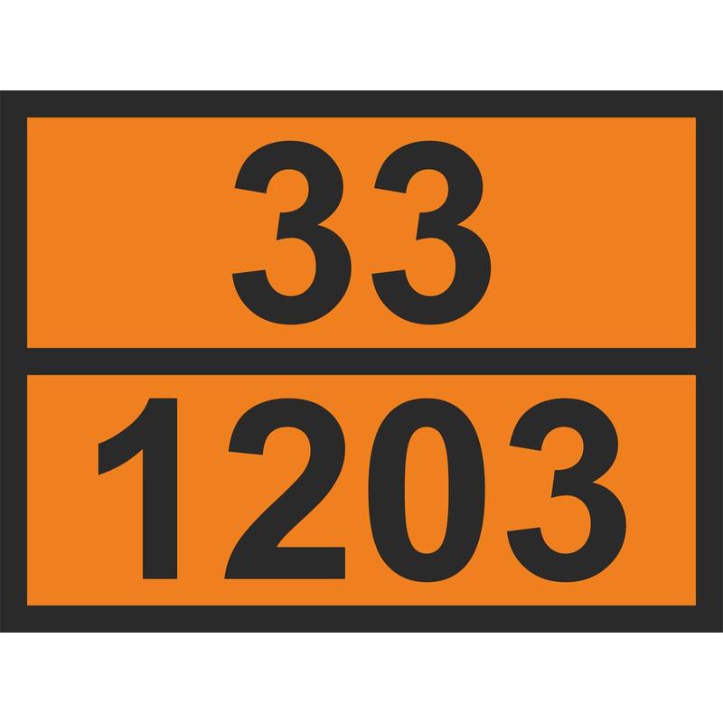 Знак безопасности «Знак (ООН) 33/1203 Бензин». Код знака: О12. Знак изготовлен из самоклеящейся полипропиленовой пленки, которая имеет стойкость к абразивным и нефтесодержащим веществам. Используют для маркировки транспортных средств, контейнеров, цистерн. Формат: 300×400 мм.