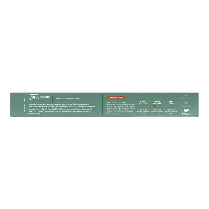 Starbucks Pike Place Roast кофе жареный молотый средней обжарки, в алюминиевых капсулах для системы Nespresso, 100% арабика, 10 шт.Ноты: сбалансированный вкус с легкими нотками какао и ароматом хрустящих обжаренных орехов.Интенсивность: 7 из 12.Размер чашки: Лунго (110 мл).Обжарка: Medium - средняя, обладает сбалансированным, мягким и насыщенным вкусом.Каждый вид кофе требует различной степени обжарки для достижения оптимального соотношения аромата, кислинки, плотности кофе и вкуса. Starbucks разделяет кофе на три вида обжарки Blonde, Medium и Dark, чтобы вы легко могли найти свой любимый кофе.Наслаждайтесь сбалансированным блендом кофейных зерен из Латинской Америки с тонким привкусом шоколада и ароматом обжаренных орехов в чашке свежесваренного кофе каждый день как в ближайшей кофейне Starbucks.Хранить в сухом прохладном месте.