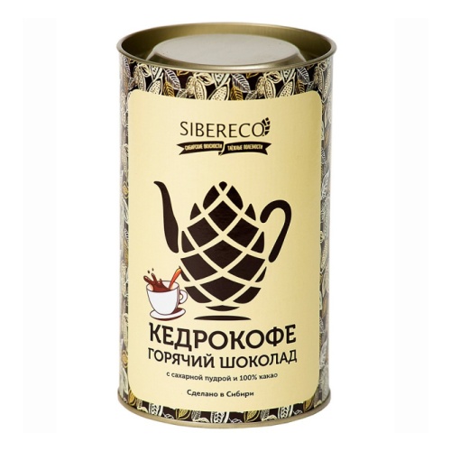 Кедрокофе Горячий шоколад. Напиток содержит 100% какао и его очень любят дети за шоколадный вкус, а родители за пользу. Для ценителей Кедрокофе мы представляем большую упаковку объёмом 500 г – тубус. В такой оригинальной упаковке наш полезный и натуральный напиток может стать не только отличным подарком, но и украшением любого семейного вечера. Белки — 5,56; жиры — 12,73; углеводы — 55,06. Энергетическая ценность в 100 г продукта: 304 ккал / 1274 кДж.