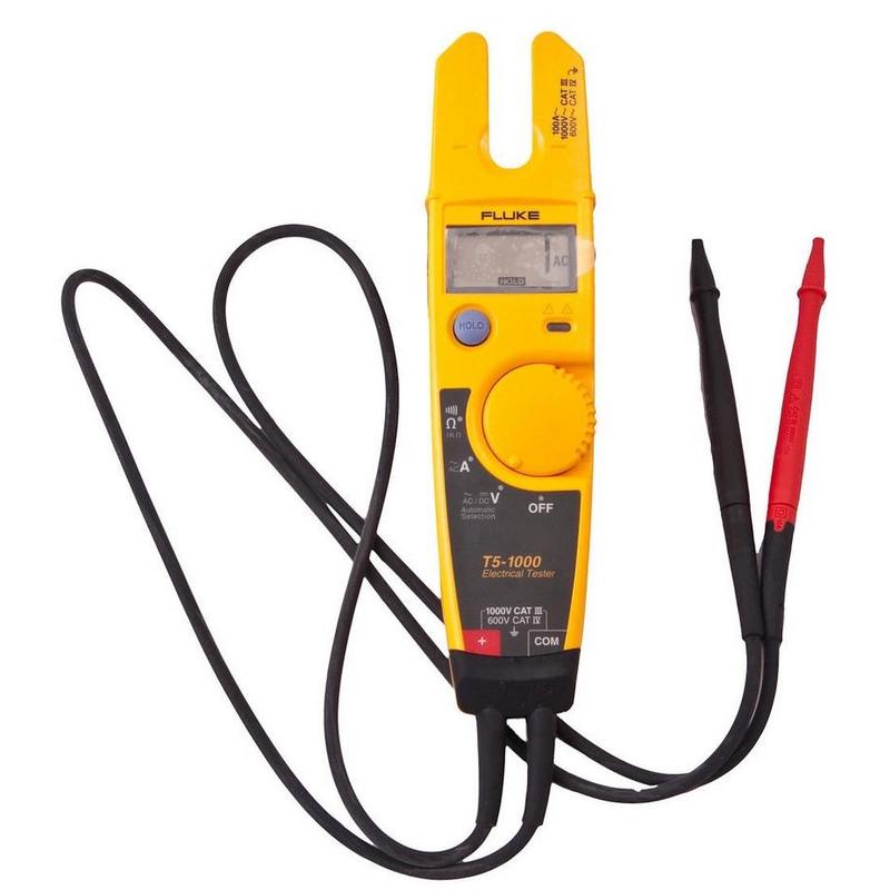 Тестер Fluke T5-1000 для измерения напряжения, силы тока и проверки целостности цепи. Все, что необходимо сделать, — это выбрать напряжение, силу тока или сопротивление, а тестер сделает все остальное. Прибор дополнен небольшим дисплеем для отображения информации. Все измерения происходят автоматически, что делает прибор максимально простым в управлении. При проверке целостности цепи звуковая индикация оповестит вас о результатах. Комфортной эксплуатации способствует наличие режима памяти, а также функции автоотключения. Fluke T5 — 1000 рассчитан на 400 ч автономной работы.Сменные наконечники щупов SlimReach позволяют дополнительно подключать различные аксессуары, например, зажимы.Прибор выдерживает падение с высоты до 3 м благодаря прочному корпусу, что позволяет продлить срок его эксплуатации. За счет герметичности подходит для работы в запыленных и с повышенной влажностью помещений. Помимо этого, прибор имеет высокий уровень безопасностит. к. защищен CAT III. На корпусе есть индикатор угрозы удара тока, который подает звуковой сигнал при превышении опасных для человека показателей.Жесткие провода аккуратно убираются на обратную сторону тестера, облегчая переноску в сумке для инструментов. Для работы прибора требуется наличие двух AA-батареек. Устройство поставляется с щупами и измерительными проводами. T5 можно поместить в защелкивающийся на ремне футляр H5, поставляемый дополнительно.