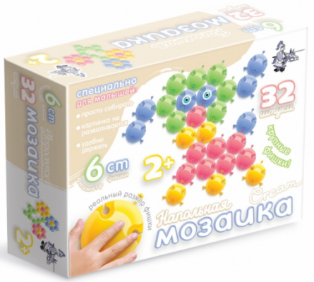 - Описание Разноцветная напольная мозаика «Cream» от компании «Десятое королевство» имеет 32 фишки с диаметром 6 см. Собирать узоры настолько просто, что мозаикой могут играться дети от 2 лет и старше. После сбора картинки не разваливаются сами по себе. Фигурки подобраны по форме и размеру специально так чтобы ребёнку было удобно их держать, но при этом он не мог их проглотить. Мозаика «Cream» поможет ребёнку не просто хорошо провести время, но также развить творчески способности, логическое мышление и креативность. Фишки представлены в красном, голубом, желтом и зелёном цветах.