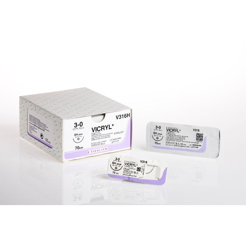 Викрил - рассасывающийся синтетический шовный материал. Обладает хорошими манипуляционными свойствами и предсказуемым периодом рассасывания. Реакция живых тканей на его имплантацию минимальна. Викрил является альтернативой натуральному Кетгуту, но обладает рядом преимуществ перед ним. По сравнению с Кетгутом, Викрил значительно удобнее в работе, так как он не скользит, более прочен и имеет предсказуемые сроки рассасывания. Рассасывание происходит постепенно, с разложением шовных нитей на кислоты - гликолевую и молочную, вслед за этим идёт ассимиляция их организмом. В течение 70 дней происходит полное рассасывание материала. На 35 сутки происходит полное заживление раны. Шовные нити Викрил применяются при операциях на сосудах, при сшивании периферических нервов, при операциях на желудочно-кишечном тракте, желчных протоках, мочевыводящей системе, в глазной хирургии, в стоматологии, при ушивании лапаротомной раны, для внутрикожных косметических швов.Викрил не применяется при оперативных вмешательствах, при которых требуется длительное сопоставление раны. Применение данных шовных нитей не рекомендовано пожилым людям, истощенным и ослабленным больным. Побочной реакцией на материал может быть временное очаговое раздражение, временная воспалительная реакция, отёчность, покраснение. Шовные нити Викрил, как инородное тело, могут обострять возникшую инфекцию.Технические характеристики: шовный материал Викрил имеет прекрасные манипуляционные свойства, достаточную прочность нити, низкую фитильность. Особое покрытие нити придаёт ей оптимальные свойства для удобства работы хирурга. За счёт специального плетения шовных нитей создается узел заданной и надёжной фиксации. Викрил вызывает незначительную первоначальную реакцию воспаления в тканях.