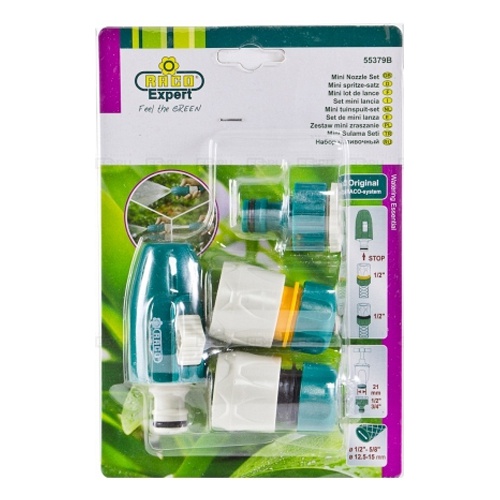 Набор поливочный RACO 4255-55379B: наконечник регулир.,соединитель 1/2",соединитель с автостопом 1/2",адаптер внешний,1/2"x3/4"