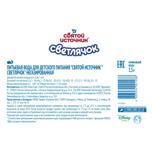 Вода питьевая детская Святой Источник Светлячок негазированная 1.5 л ПЭТ, 6шт/уп