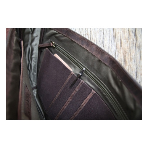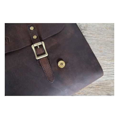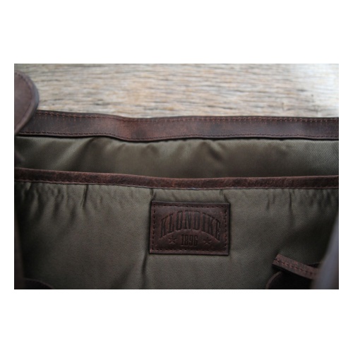 Элегантное тиснение «Klondike» на лицевой стороне и небольшое, ненавязчивое тиснение c надписью 'made with passion' на тыльной стороне, мастерски сделаны вручную на высочайшем уровне. • Прочные металлические части латунного цвета подчеркивают высокое качество продукта. Благодаря своим размерам (длина – 38 см, высота - 33 см и глубина - 7 см) сумка позволяет хранить многочисленные вещи, например, большую папку и вещи схожего размера.