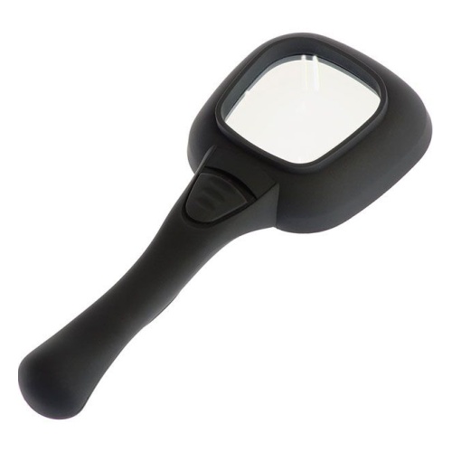 Лупа с увеличением 3x в черном пластиковом корпусе. По периметру оправы линзы расположены 6 светодиодов -5 для подсветки и 1 для проверки водяных знаков. С обратной стороны изогнутой 12 см ручки расположен переключатель режимов освещения.