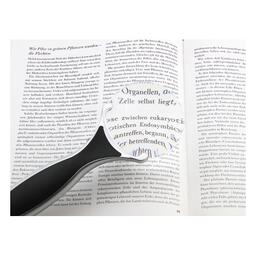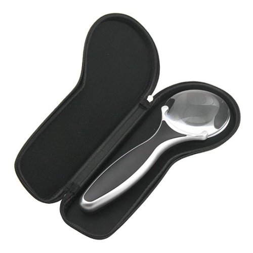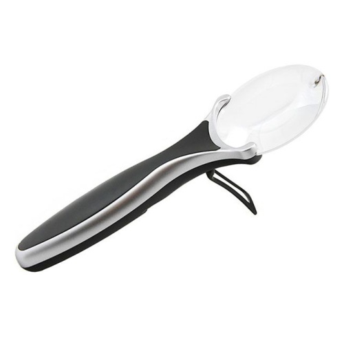 Конструкция лупы содержит выкидную подпорку для установки на плоскую поверхность.