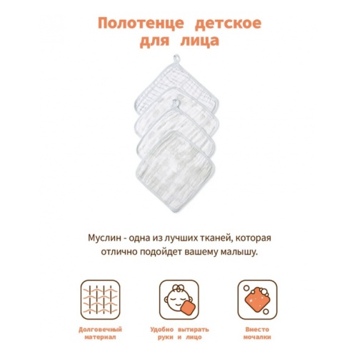 Качество. В составе 100% муслиновый хлопок для того, чтобы нежная кожа на лице ребёнка не раздражалась и не повреждалась во время обтирания. Благодаря тому, что ткань лёгкая и нежная, она быстро сохнет. Полотенце износостойкое, ткань не теряет своих свойств от ежедневного использования.