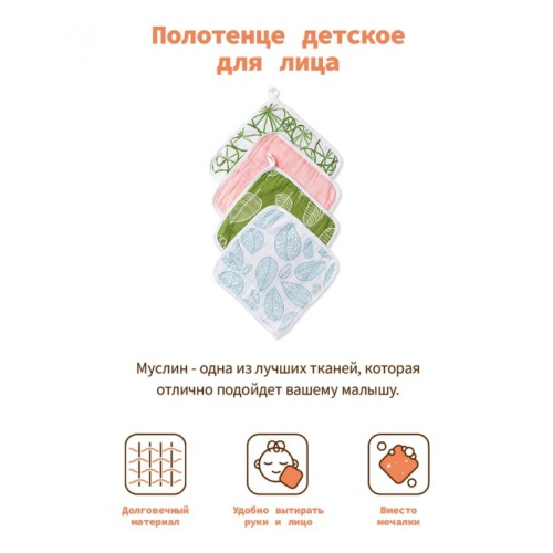 Качество. В составе 100% муслиновый хлопок для того, чтобы нежная кожа на лице ребёнка не раздражалась и не повреждалась во время обтирания. Благодаря тому, что ткань лёгкая и нежная, она быстро сохнет. Полотенце износостойкое, ткань не теряет своих свойств от ежедневного использования.