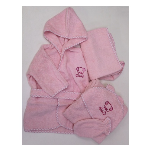Топотушки ММ-4 Комплект (уголок, халат, полотенце, рукавичка) махра вышивка в который входит все необходимо для принятия водных процедур новорожденного малыша.