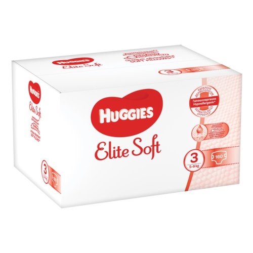 Подгузники Huggies Elite Soft (Хаггис Элит Софт) размер 3 / M, 160 штука (вес 5-9 кг) содержат «дышащие» материалы, не вызывают опрелостей и раздражения, не натирают, моментально впитывают влагу, помогая сохранить кожу сухой, застежки-липучки удобно застегиваются. Подходят для мальчиков и девочек.