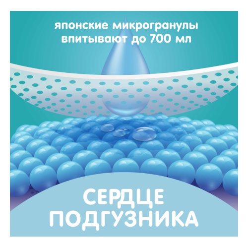 Древесный натуральный впитывающий пух с микрогранулами WATERLOCK надежно запирают и удерживают жидкость внутри подгузника.