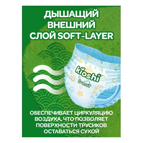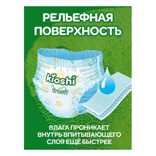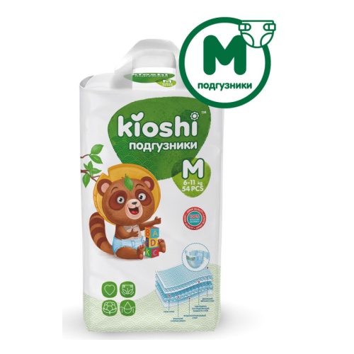 Подгузники Kioshi M 6-11 кг 54 шт.KIOSHI - комфорт стал еще доступнее.Kioshi – это бренд, который вобрал в себя все самые лучшие характеристики рынка детских подгузников.Подгузники и трусики отличаются повышенной скоростью впитывания влаги, неповторимой мягкостью и гипоаллергенными свойствами.Сложная многослойная структура позволяет гарантировать максимальную эффективность.· Дышащая водонепроницаемая наружная поверхностьМягкий и эластичный нетканый материал приятен на ощупь и обеспечивает малышу особый комфорт.· Равномерно распределяющий жидкость слойСверхмягкая бумага надежно распределяет влагу по всей поверхности впитывающего слоя, не давая скопиться жидкости в одном месте.· Нано-нитиНано-нити японского качества надежно фиксируют абсорбент, что предотвращает комкование и провисание подгузника.· Японский супер-абсорбентАбсорбент (производство Японии) с добавлением целлюлозного пуха превращает влагу в гель.· Внутренний слойНетканый слой из натурального хлопка с добавлением полиэстера максимально комфортен для нежной кожи ребенка.