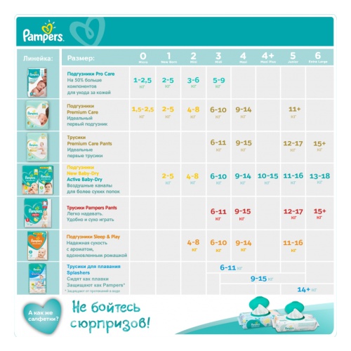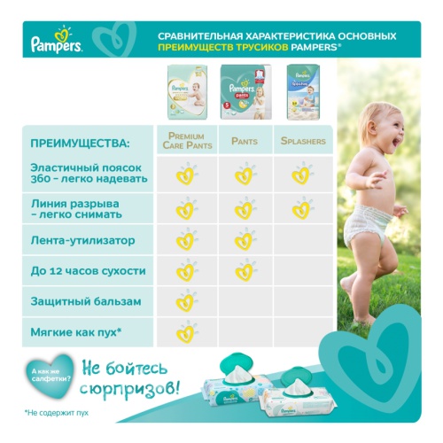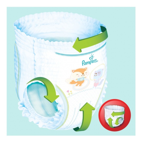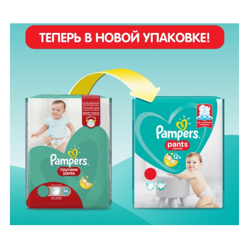 Когда ребенок становится активным и то и дело пытается уползти, смена подгузника может оказаться нелегкой задачей. Тогда наступает время для трусиков Pampers Pants. Трусики Pampers Pants легко надеть, и они обеспечивают до 12 часов сухости. Мягкий поясок позволяет им адаптироваться к движениям малыша, обеспечивая комфорт и защиту. Революционная технология помогает распределить влагу равномерно по трем впитывающим каналам и запереть ее, не допуская образования мокрого комка и обеспечивая сухость малышу. С трусиками Pampers Pants сменить подгузник можно просто и быстро, даже когда ребенок уползает. *по сравнению с предыдущими подгузниками.