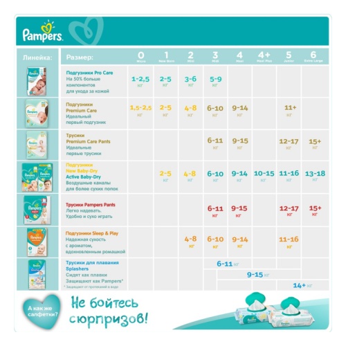 Три впитывающих канала: каналы помогают равномерно распределять влагу по подгузнику, предотвращая появления мокрого комка между ножками, по сравнению с подгузниками Pampers предыдущего поколения.